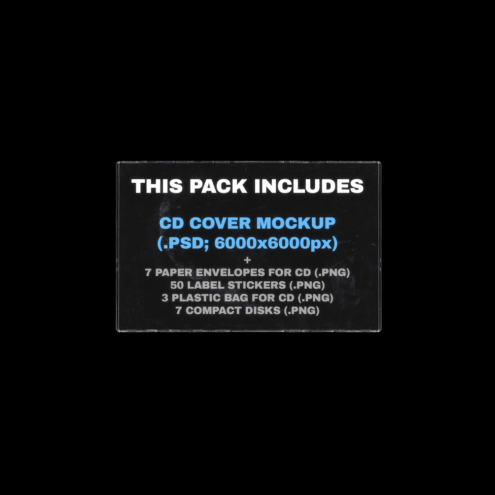 "CD COVER MOCKUP PACK" is a versatile kit for creating CD covers. Includes CD cover layout, paper envelopes, stickers, plastic CD bags and CDs. All elements are easily customizable, allowing you to create unique designs.