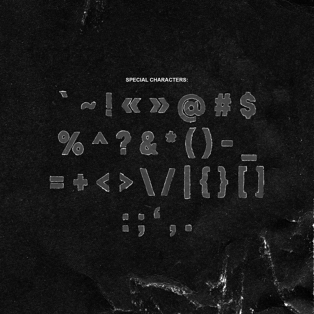 A-Z (2 versions), 0-9 (2 versions) and 33 special characters